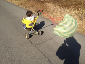 キミは何者?三輪車にパラシュートくっつけて、ぶっとばします!!